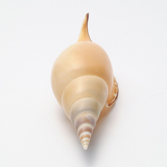 比較的に殻が薄いため全体として重量が軽く、光沢があります。螺塔が高く、殻頂はとがっていますが、体層がふくらんでいるため決して鋭角な印象だけではありません。貝表はほとんど平滑で薄い淡褐色です。殻口外唇に短い牙状突起があります。